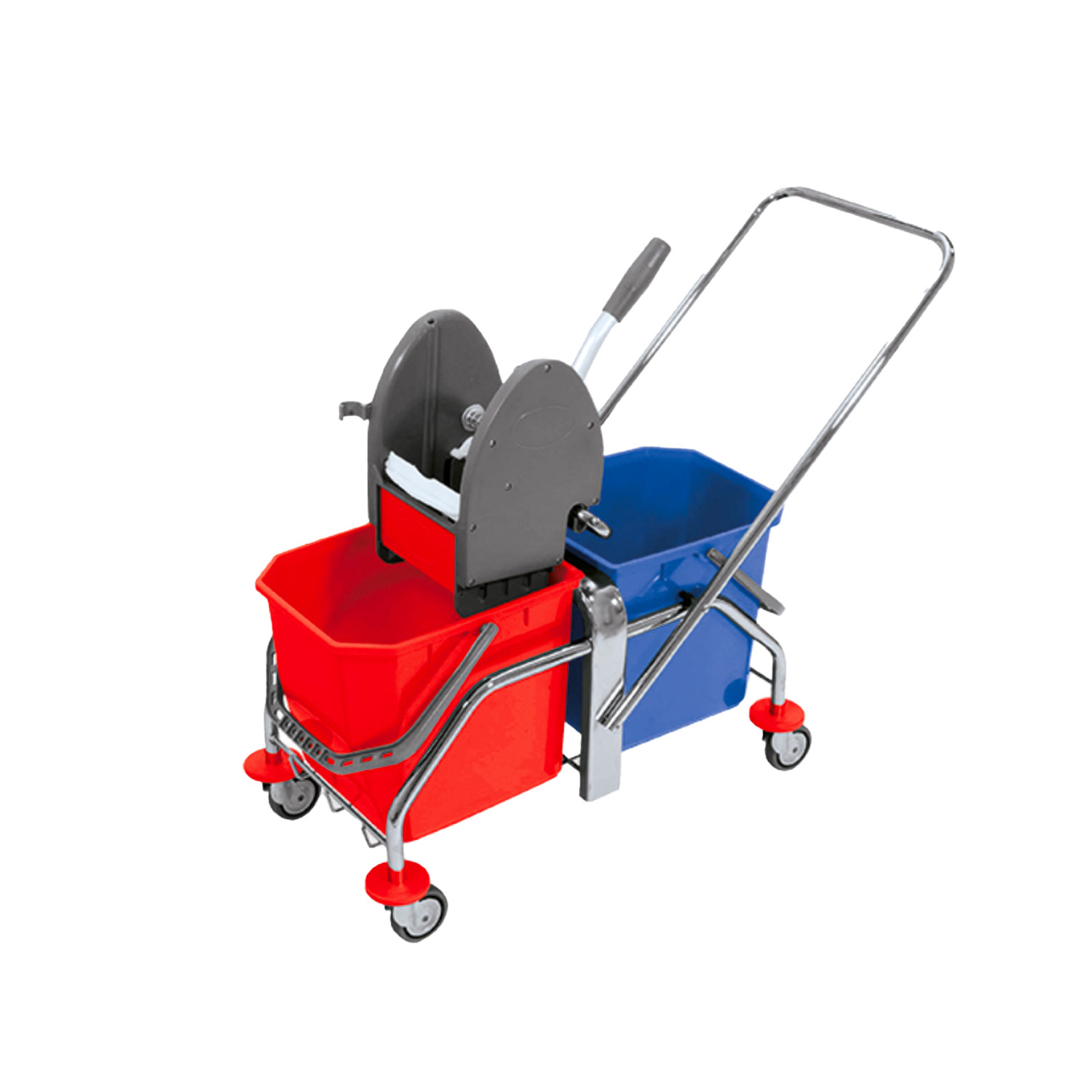 Carrello cromato doppio 2×15, completo di 2 secchi da 25 lt, strizzatore per mop, piantone portapressa girevole con antirovesciamento, manico reversibile, paracolpi e 4 ruote Ø 80 mm con parafilo.