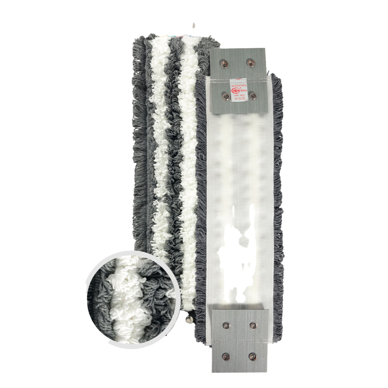 Frangia di lavaggio in microfibra attacco BOTTONI, cm 45×10. Composta da 3+2 strisce di filato ritorto (disposte alternate) cucite su supporto in poliestere ad alta tenacità termofissato a secco a 200.C. Bottoni di aggancio in acciaio inox AISI 304. Composizione filato: 50% poliestere per garantire alte performance di pulizia della superficie trattata, imprigionando e trattenendo lo sporco, 30% poliammide per un’elevata forza meccanica e capacità di trattenere lo sporco e 20% viscosa per un lento rilascio della soluzione pulente