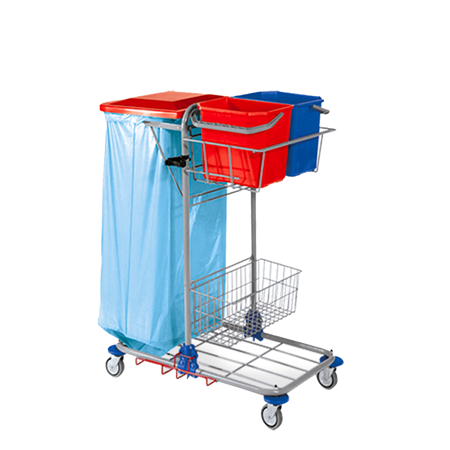 Carrello multiuso “piccolo”, cromato, completo di reggisacco e anello in gomma, coperchio agganciato, 4 piastre di fissaggio, cestello portasecchi, cestello portaoggetti, portascopa, portamanico, 2 secchi da 12 lt, paracolpi e ruote Ø 80 mm con parafilo.
