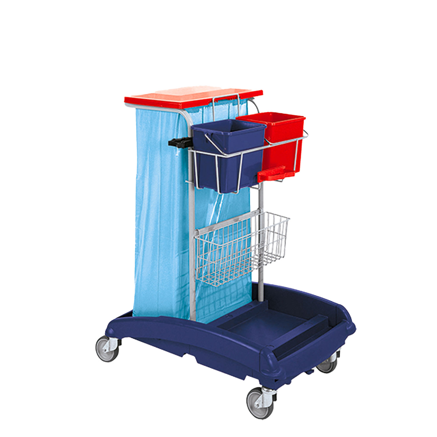 Carrello multiuso Ideabase, composto da: base in plastica con 4 ruote Ø 100 mm, montante in acciaio con reggisacco e maniglia (rilsan), anello di gomma, cestello portasecchi (rilsan), cestello portaoggetti (rilsan), portamanico in gomma, portamanico “piccolo” in plastica e 2 secchi da 6 lt.