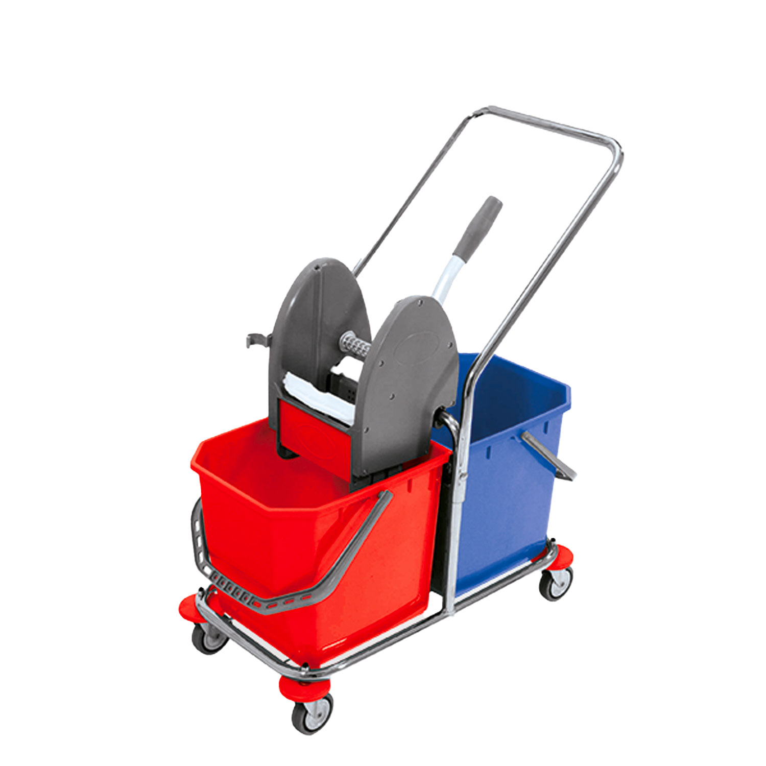 Carrello cromato doppio 2×25, completo di 2 secchi da 25 lt, strizzatore per mop, manico fisso, paracolpi e 4 ruote Ø 80 mm con parafilo.