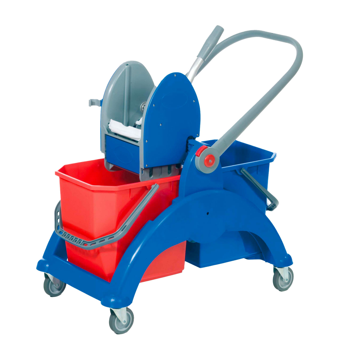 Carrello in plastica a 2 secchi da 25 lt, completo di strizzatore per mop, manico in plastica e 4 ruote Ø 80 mm.