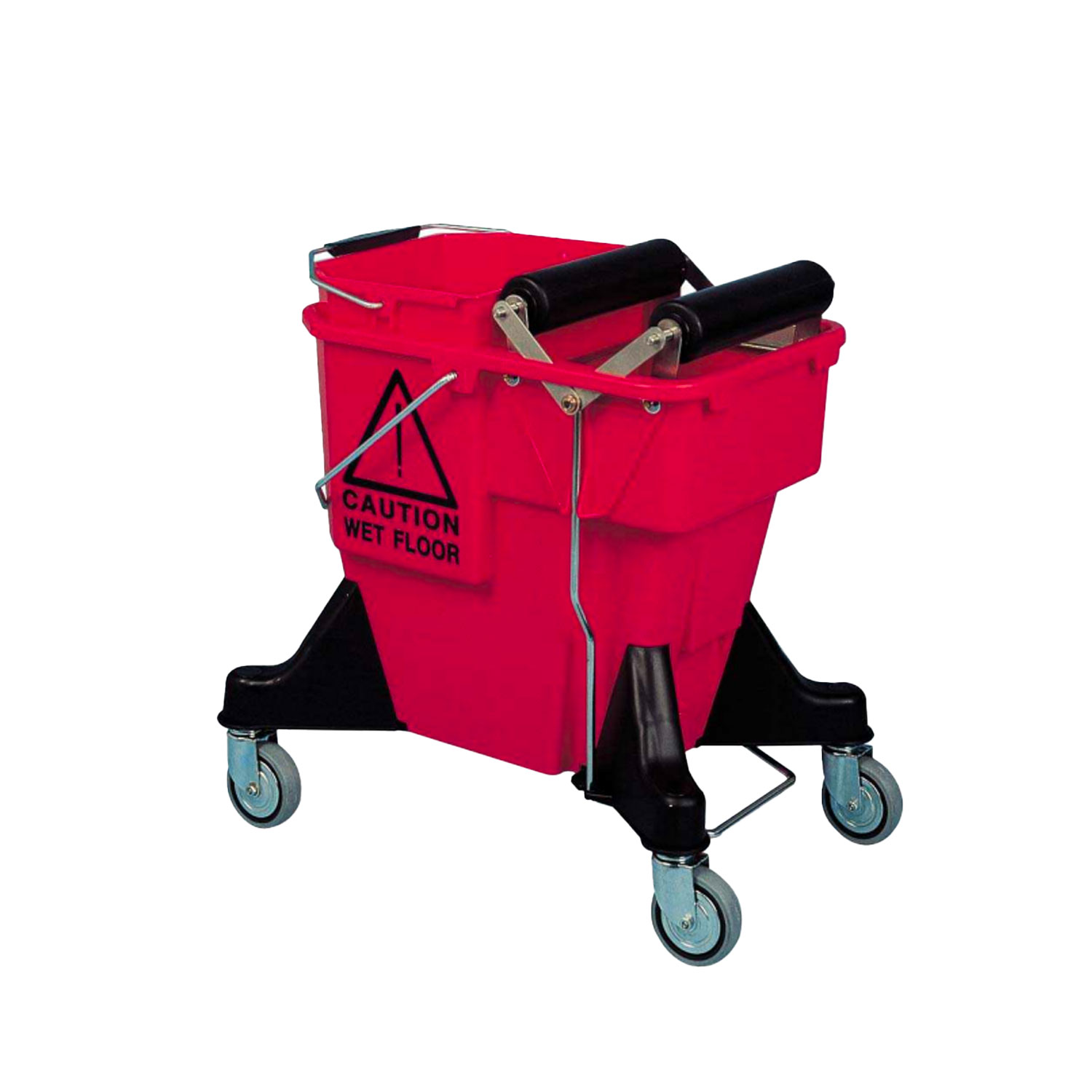 Secchio carrellato ergonomico in plastica (PP) da 20 lt (10+10) completo di 1 secchio da 12 lt, 2 rulli elastici con movimento a pedale, leveraggi in acciaio inox (AISI 304), griglietta di separazione dello sporco, 4 ruote Ø 80 mm con parafilo e supporti di sostegno. Colore standard: rosso.