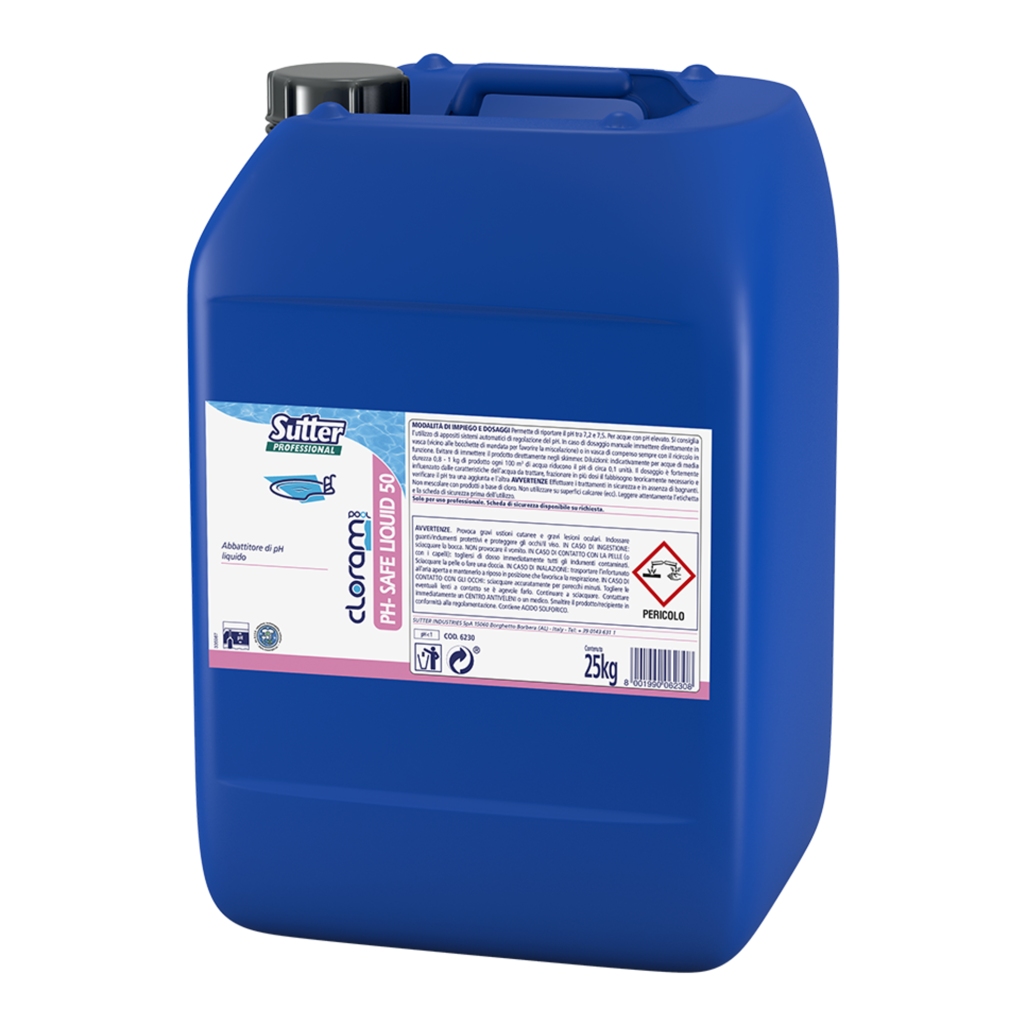 PH-SAFE LIQUID 50 SUTTER è un abbattitore di pH liquido a base di acido solforico, progettato per il trattamento delle acque di piscina con pH elevato. Perfetto per mantenere il pH tra 7,2 e 7,5, garantisce un’acqua cristallina evitando intorbidamenti, incrostazioni nei filtri e rallentamenti nell'azione del cloro. Ideale per l’uso con pompe dosatrici automatiche.